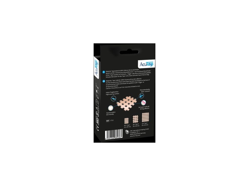 Křížové tejpy ACU TOP jsou neelastické mřížkové pásky určené k cílenému nalepení na spoušťové a akupunkturní body. Po nalepení vzniká jemné nadzvednutí pokožky, které může podpořit uvolnění napětí, zlepšit tok energie a stimulovat přirozené regenerační procesy bez použití léků. Tejpy jsou hypoalergenní, voděodolné, bez latexu a příjemné na pokožku.